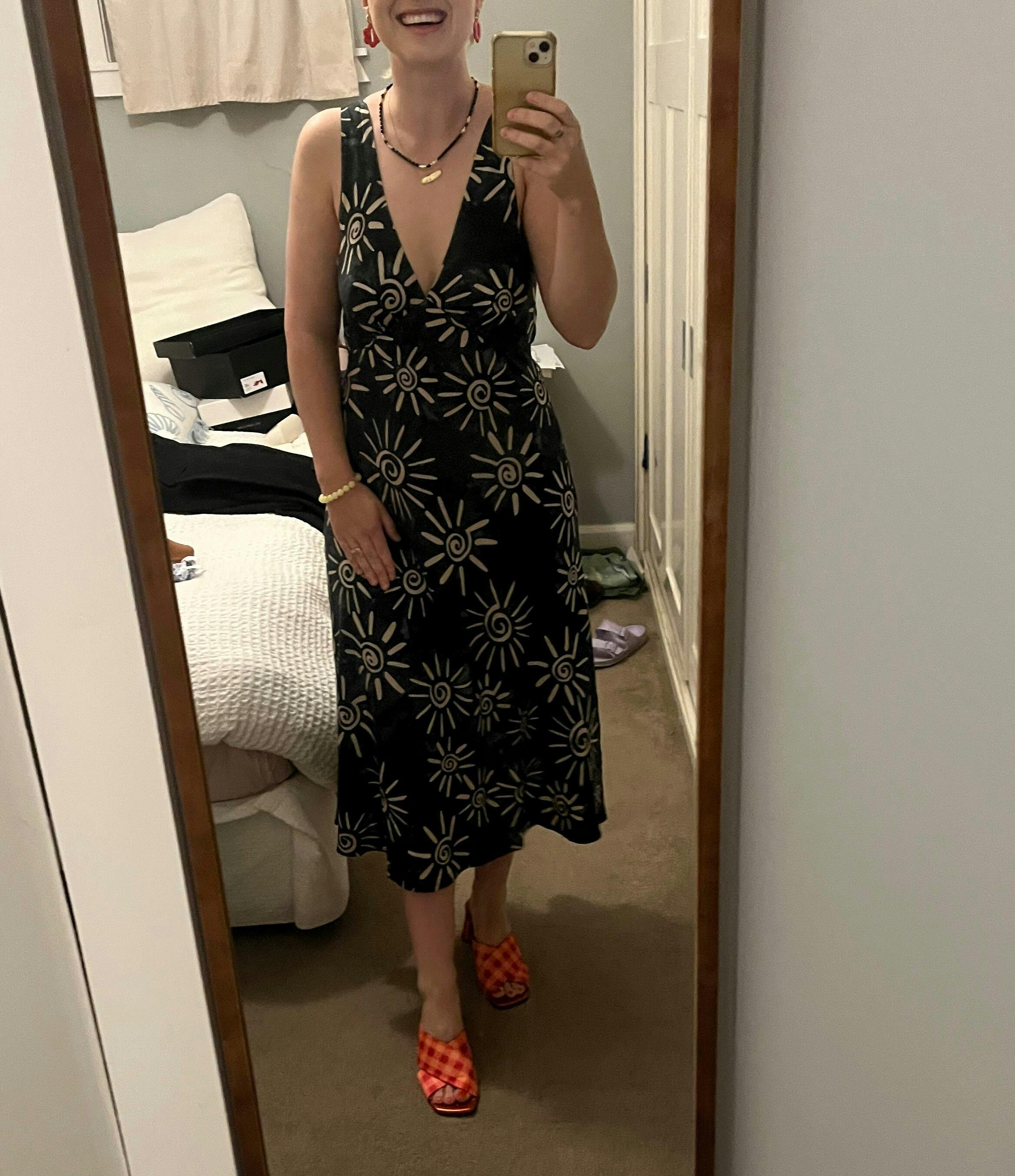 Love the cut, love the pattern and the material is so nice! I sized down and still fits nicely!