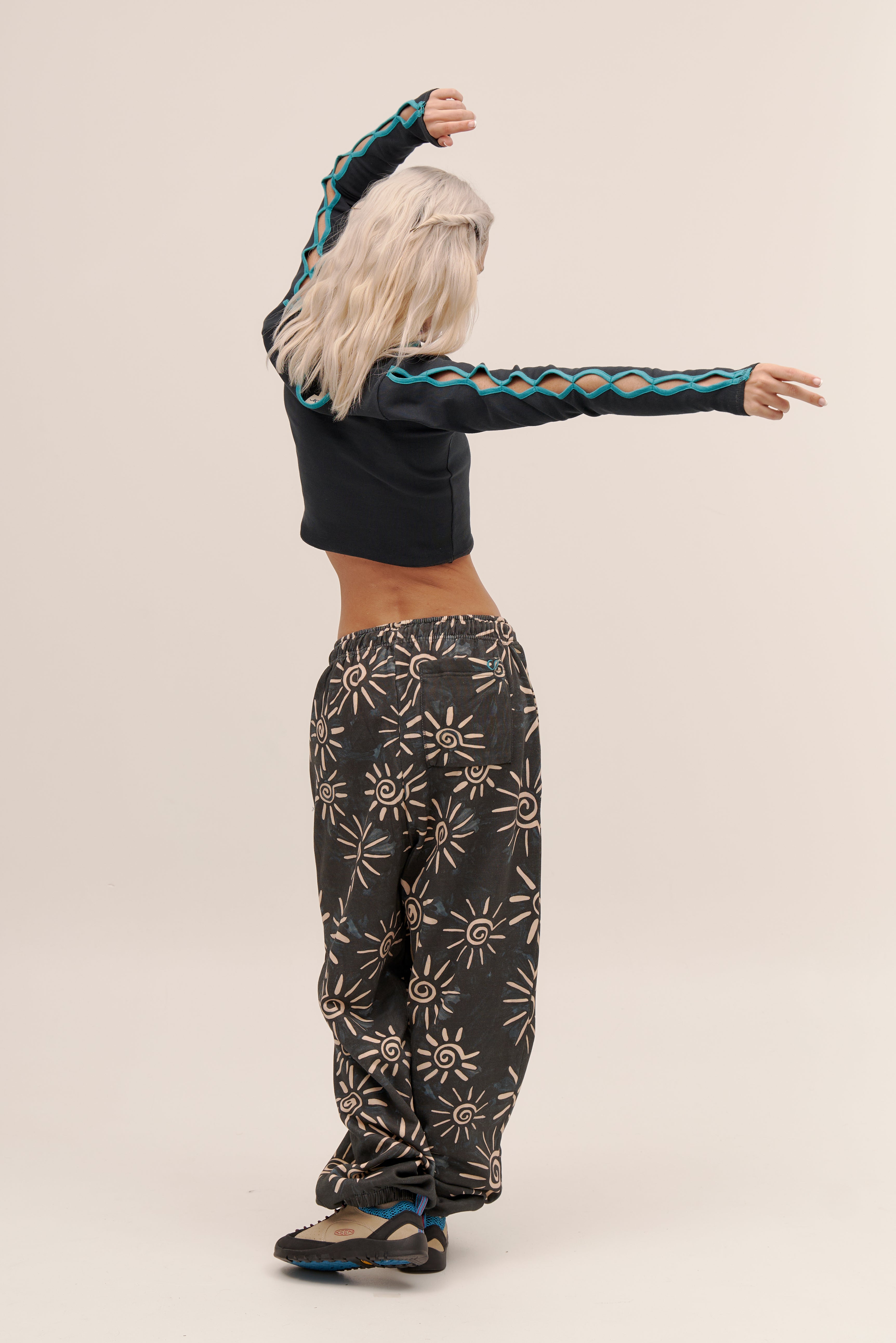 Kellie wears our track pant in size XS. Kellie is petite and would normally wear a size XXS and as such the fit on these is extra slouchy.